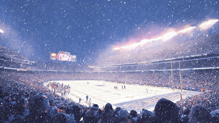• Snowfall intensifies by halftime, challenging both offenses.
